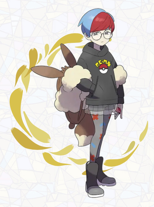 ツートンカラーの髪に、イーブイのバッグが特徴的ですね。